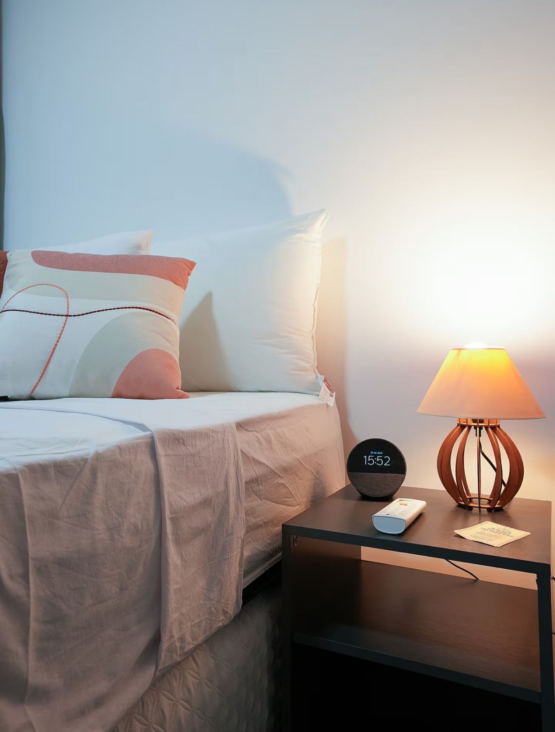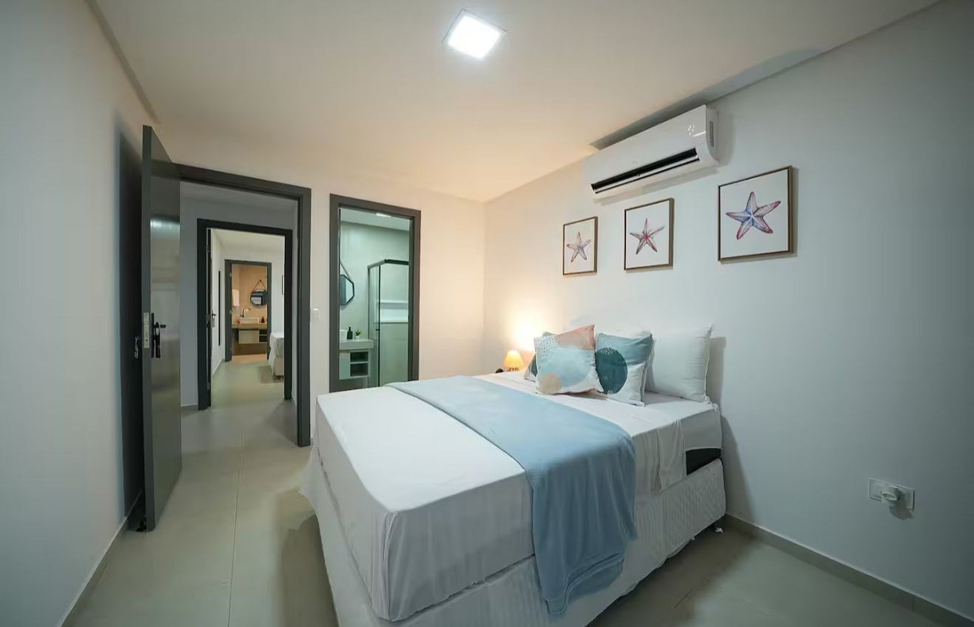 - Suíte 2 - Estrela do Mar: cama de casal + auxiliar (3 pessoas), ar-condicionado, closet com cabides, espelho, cabeceira, abajur e Alexa;