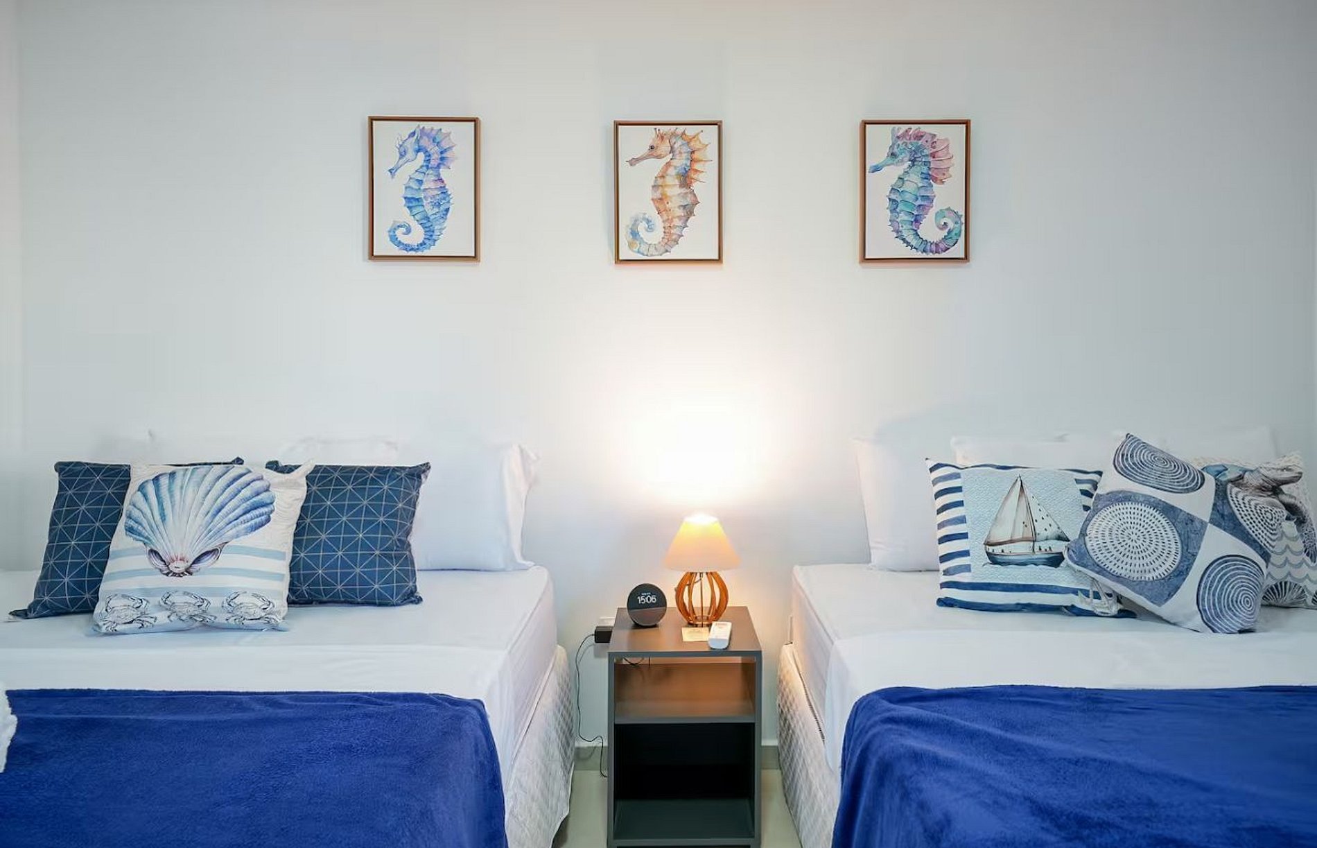 - Suíte 3 - Cavalo Marinho: 2 camas queen (4 pessoas), ar-condicionado, closet com cabides, cabeceiras, abajur e Alexa